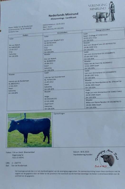 Onze certificaten zijn professioneel vormgegeven en tonen de volledige bloedlijn van het dier, inclusief foto’s en bekende voorouders. Voor leden zijn deze certificaten kosteloos verkrijgbaar.