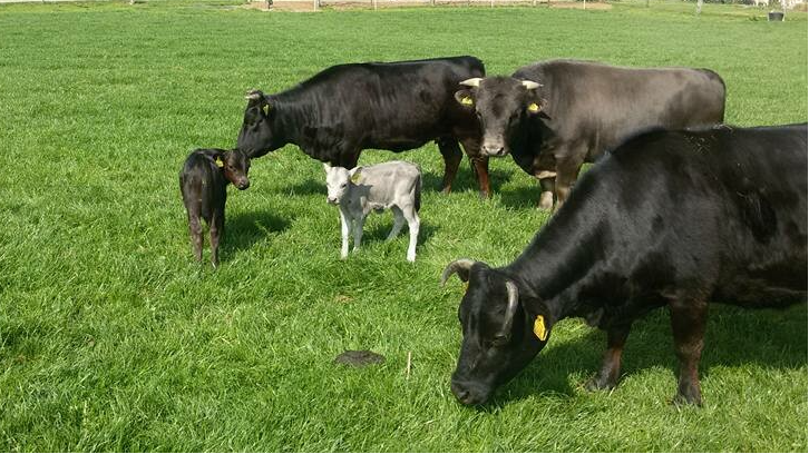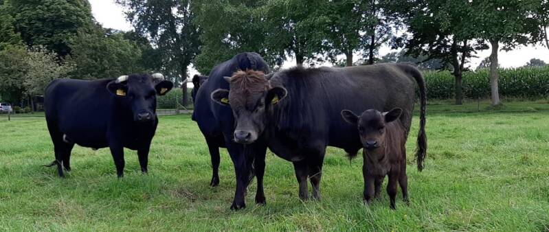 Enkele Dahomey koeien in de kleur grijs en zwart.